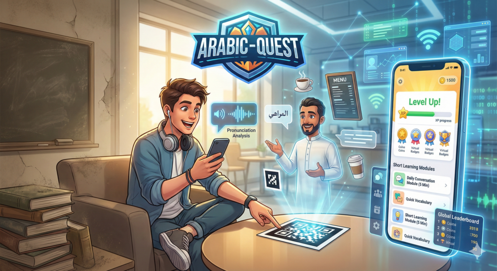 Solusi konkret yang ditawarkan adalah aplikasi mobile ARABIC-QUEST, sebuah platform pembelajaran microlearning berbasis gamifikasi dan augmented reality yang dirancang khusus untuk meningkatkan kemahiran muhadatsah mahasiswa Pendidikan Bahasa Arab non-native speaker. Produk ini mengintegrasikan tiga fitur utama yang saling mendukung: Pertama, modul microlearning yang memecah materi muhadatsah menjadi segmen-segmen singkat (5-10 menit) dan terstruktur, mencakup kosakata, tata bahasa, dan contoh dialog kontekstual yang mudah diakses kapan saja melalui smartphone. Kedua, sistem gamifikasi yang membangun motivasi berkelanjutan melalui mekanisme poin, level progresif, tantangan berbicara, dan penghargaan virtual yang disesuaikan dengan pencapaian pembelajaran individual. Ketiga, fitur augmented reality berbasis marker yang memungkinkan mahasiswa mengalami simulasi interaksi berbicara dengan avatar native speaker virtual dalam konteks nyata—pengguna mengarahkan kamera smartphone ke marker untuk memunculkan objek 3D dan lingkungan virtual, lalu berinteraksi melalui perekaman suara yang dianalisis sistem untuk memberikan umpan balik pelafalan dan skor kemahiran. Struktur aplikasi mencakup halaman login, dashboard utama dengan akses ke modul pembelajaran, peringkat global, dan fitur AR, serta sistem evaluasi otomatis yang melacak progres pengguna secara real-time.