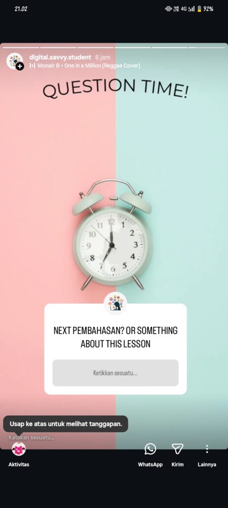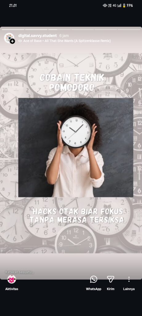 Secara teknis, proyek ini bekerja dengan strategi “menjemput bola” di ekosistem digital mahasiswa. Instagram Stories bertindak sebagai agen teknologi yang menyajikan materi manajemen waktu (seperti Pomodoro) dan metakognisi tepat saat mahasiswa mengakses media sosial mereka. Ini adalah bentuk kolaborasi konkret antara kecerdasan manusia (pengguna) dan algoritma teknologi. Albert, Lin, Spector, & Dunn (2021) dalam “Bridging Human Intelligence and Artificial Intelligence” menekankan bahwa sinergi antara manusia dan sistem cerdas/teknologis sangat krusial untuk mengoptimalkan potensi belajar, di mana teknologi bertindak sebagai scaffolding bagi proses metakognitif manusia.