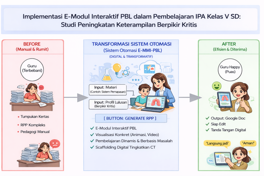 Proyek E-MMI-PBL Kritis berhasil menjawab masalah inti pembelajaran IPA di SD, yaitu kesulitan memahami konsep abstrak dan kebutuhan akan pelatihan Berpikir Kritis, dengan solusi yang efisien. Berdasarkan bukti uji coba lapangan dan validasi ahli, produk ini berhasil menghasilkan lingkungan belajar yang sistematis dan praktis. Keberhasilannya terletak pada sintesis yang koheren antara Visualisasi Konkret (Fitur Teknologi) dan Inkuiri Terstruktur (Problem-Based Learning), yang secara efektif mengubah kendala kognitif siswa SD menjadi kesempatan untuk meningkatkan kapabilitas kognitif dan non-kognitif yang terukur. E-MMI-PBL Kritis adalah demonstrasi nyata bahwa dengan desain instruksional yang cermat, teknologi dapat menjadi katalisator bagi hasil pembelajaran yang etis.
