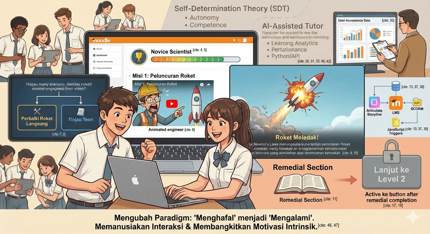 Proyek ini dibangun di atas fondasi Self-Determination Theory (SDT) dari Deci & Ryan, yang menekankan pentingnya pemenuhan kebutuhan otonomi, kompetensi, dan keterhubungan untuk memicu motivasi intrinsik. Secara teoritis, pemberian kebebasan memilih jalur belajar dipercaya dapat meningkatkan motivasi tersebut. Dalam praktik di lapangan, teori ini terbukti valid melalui fitur branching scenario, di mana siswa merespons positif kesempatan untuk memilih sendiri apakah mereka ingin belajar teori dulu atau langsung praktik. Hal ini memvalidasi bahwa siswa menghargai otonomi dalam lingkungan digital. Namun, terdapat kesenjangan menarik antara teori kompetensi (mastery) dengan realitas adaptasi siswa. Meskipun prinsip Mastery Learning diterapkan untuk menjamin pemahaman tuntas, ditemukan fakta bahwa sebagian siswa yang terbiasa dengan metode konvensional sempat merasa frustrasi. Ketidakmampuan untuk “mempercepat” atau melewati materi ketika gagal dalam simulasi roket awalnya dianggap sebagai hambatan sistem, bukan proses belajar. Temuan ini merefleksikan bahwa transisi menuju pembelajaran mandiri berbasis kompetensi memerlukan tidak hanya kesiapan teknologi, tetapi juga adaptasi budaya belajar dari pihak siswa agar mereka bisa menerima kegagalan sebagai bagian dari proses peningkatan kompetensi.