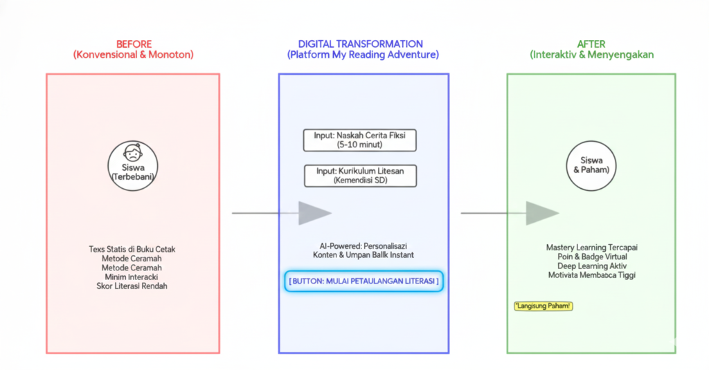 Produk ini memiliki fitur unggulan berupa Sistem Misi Berjenjang (Mission-Based Learning) dan Umpan Balik Adaptif. Fitur ini menjadi “jantung” proyek karena memaksa siswa untuk memahami isi bacaan sebelum dapat melangkah ke misi berikutnya. Integrasi produk ini sangat fleksibel (interoperabilitas tinggi) karena dikembangkan dengan format yang ringan dan dapat diakses melalui berbagai peramban web tanpa memerlukan instalasi rumit. Solusi yang ditawarkan sangat spesifik: fitur “Buka Peti” atau “Buka Amplop” sebelum membaca berfungsi untuk membangun rasa ingin tahu (curiosity), sementara sistem penskoran otomatis memangkas waktu guru dalam mengevaluasi pemahaman siswa secara individual.