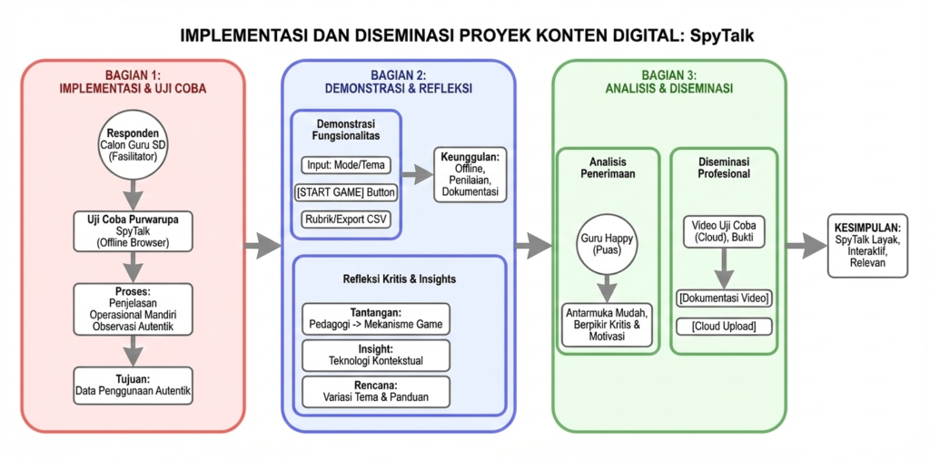 Sebagai bagian dari diseminasi hasil proyek, seluruh sesi uji coba direkam dalam bentuk video yang menampilkan interaksi responden dengan media SpyTalk. Dokumentasi ini bertujuan untuk menunjukkan proses implementasi produk secara nyata dan profesional. Video uji coba diunggah ke layanan penyimpanan awan dengan pengaturan akses terbuka sebagai bukti pelaksanaan tugas.