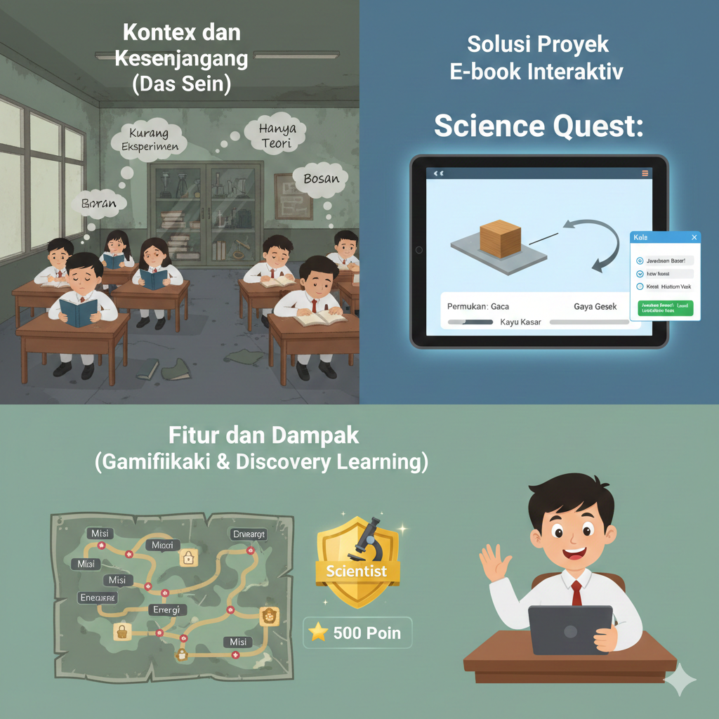 Solusi yang ditawarkan adalah pengembangan E-book Interaktif “Science Quest”. E-book ini memadukan teks, video, simulasi animasi, dan kuis adaptif.