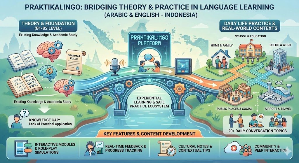 Pengembangan platform “PraktikaLingo” didasarkan pada definisi teknologi pendidikan sebagai studi dan praktik etis untuk memfasilitasi pembelajaran dan meningkatkan kinerja melalui penciptaan, penggunaan, dan pengelolaan proses serta sumber daya teknologi yang tepat. Harapan utama dari proyek ini adalah melampaui sekadar penyampaian materi (content delivery) menuju penciptaan pengalaman belajar yang bermakna, di mana desain pembelajaran tidak hanya berfokus pada konten preskriptif tetapi juga pada keterlibatan emosional dan pengalaman pengguna (User Experience) yang mendalam bagi pembelajar (Hokanson, B., et.al 2018). Proyek ini bertujuan untuk memfasilitasi pembelajaran bahasa asing (Arab dan Inggris) yang tidak hanya berhenti pada hafalan permukaan (surface learning), melainkan mencapai pembelajaran mendalam (deep learning) di mana pembelajar dapat menghubungkan ide-ide, melihat pola, dan menerapkan pengetahuan dalam situasi baru. Dengan demikian, “PraktikaLingo” diharapkan mampu menciptakan lingkungan belajar yang memungkinkan peserta didik mengambil kepemilikan atas pembelajaran mereka dan terlibat dalam inkuiri yang relevan dengan kehidupan nyata (Januszewski, A., & Molenda, M. (Eds.). 2008).